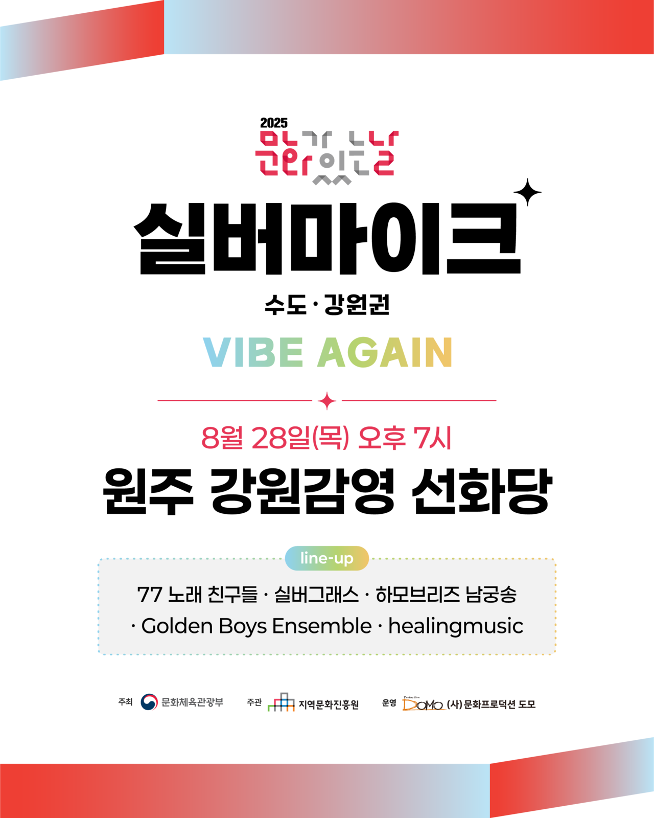 🎵 일시 : 2025년 8월 28일(목) 오후 7시🎵 장소 : 원주 강원감영 선화당🎵 라인업 : 77 노래친구들 / 실버그래스 / 하모브리즈 남궁송 / Golden Boys Ensemble / healingmusic