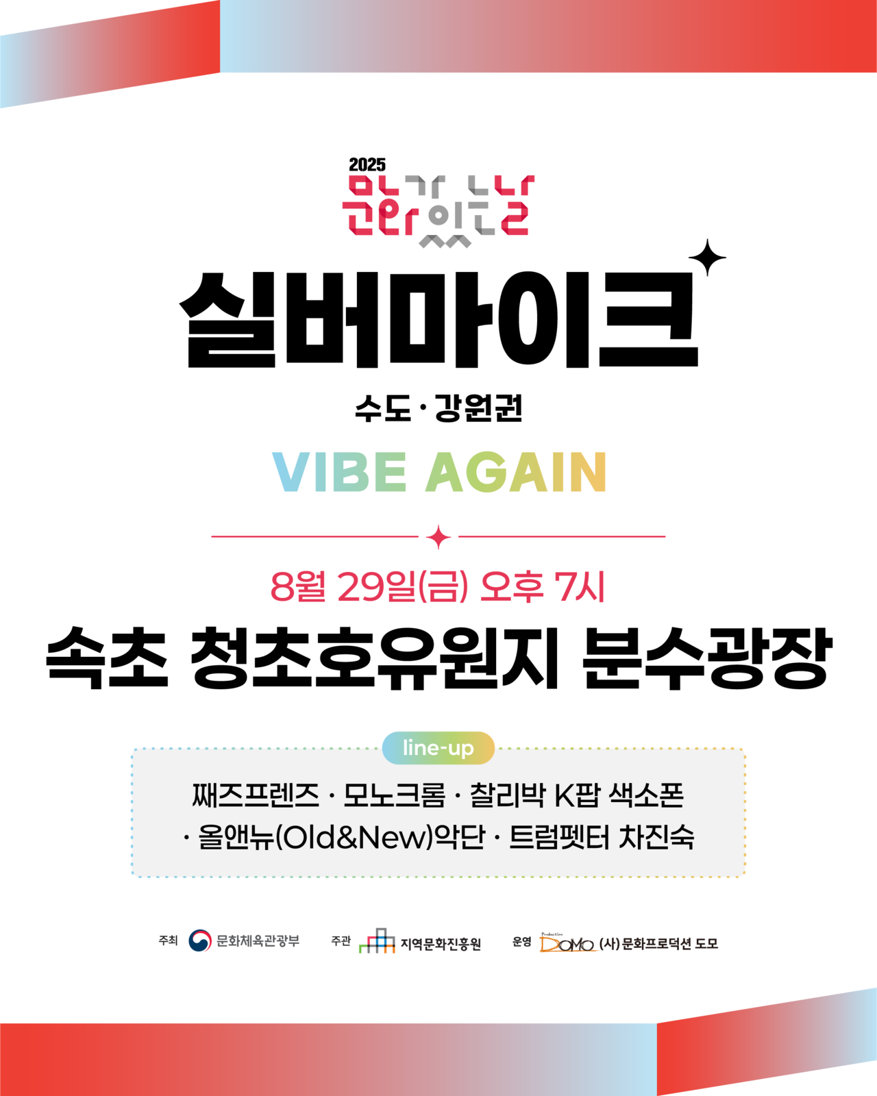 🎵 일시 : 2025년 8월 29일(금) 오후 7시🎵 장소 : 속초 청초호유원지 분수광장🎵 라인업 : 째즈프렌즈 / 모노크롬 / 찰리박 K팝 색소폰 / 올앤뉴악단 / 트럼펫터 차진숙
