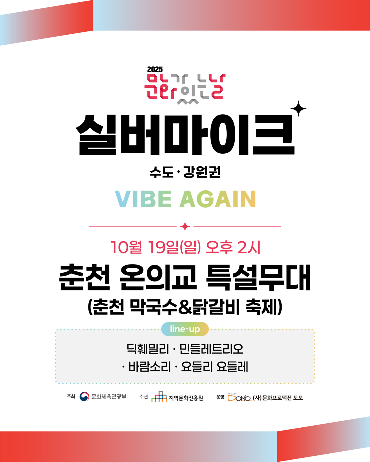 2025 문화가 있는 날 실버마이크 수도·강원권10월 네 번째 공연🎵 일시 : 2025년 10월 19일(일) 오후 2시🎵 장소 : 춘천 온의교 특설무대 (춘천 막국수&닭갈비 축제)🎵 라인업 : 딕훼밀리 / 민들레트리오 / 바람소리 / 요들리 요들레