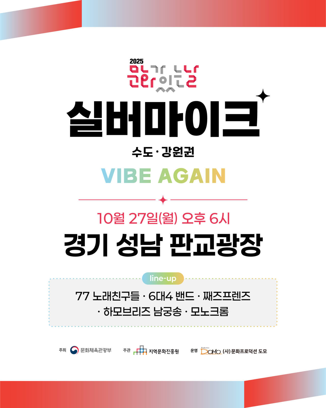 2025 문화가 있는 날 실버마이크 수도·강원권10월 일곱 번째 공연🎵 일시 : 2025년 10월 27일(월) 오후 6시🎵 장소 : 경기 성남 판교광장🎵 라인업 : 77노래 친구들 / 6대4 밴드 / 째즈프렌즈 / 하모브리즈 남궁송 / 모노크롬