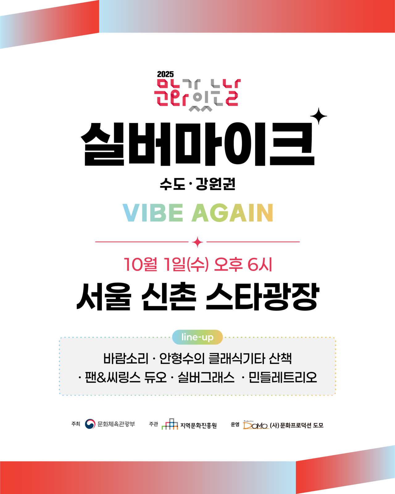 2025 문화가 있는 날 실버마이크 수도·강원권10월 첫 번째 공연🎵 일시 : 2025년 10월 1일(수) 오후 6시🎵 장소 : 서울 신촌 스타광장🎵 라인업 : 바람소리 / 안형수의 클래식기타 산책 / 팬&씨링스 듀오 / 실버그래스 / 민들레트리오